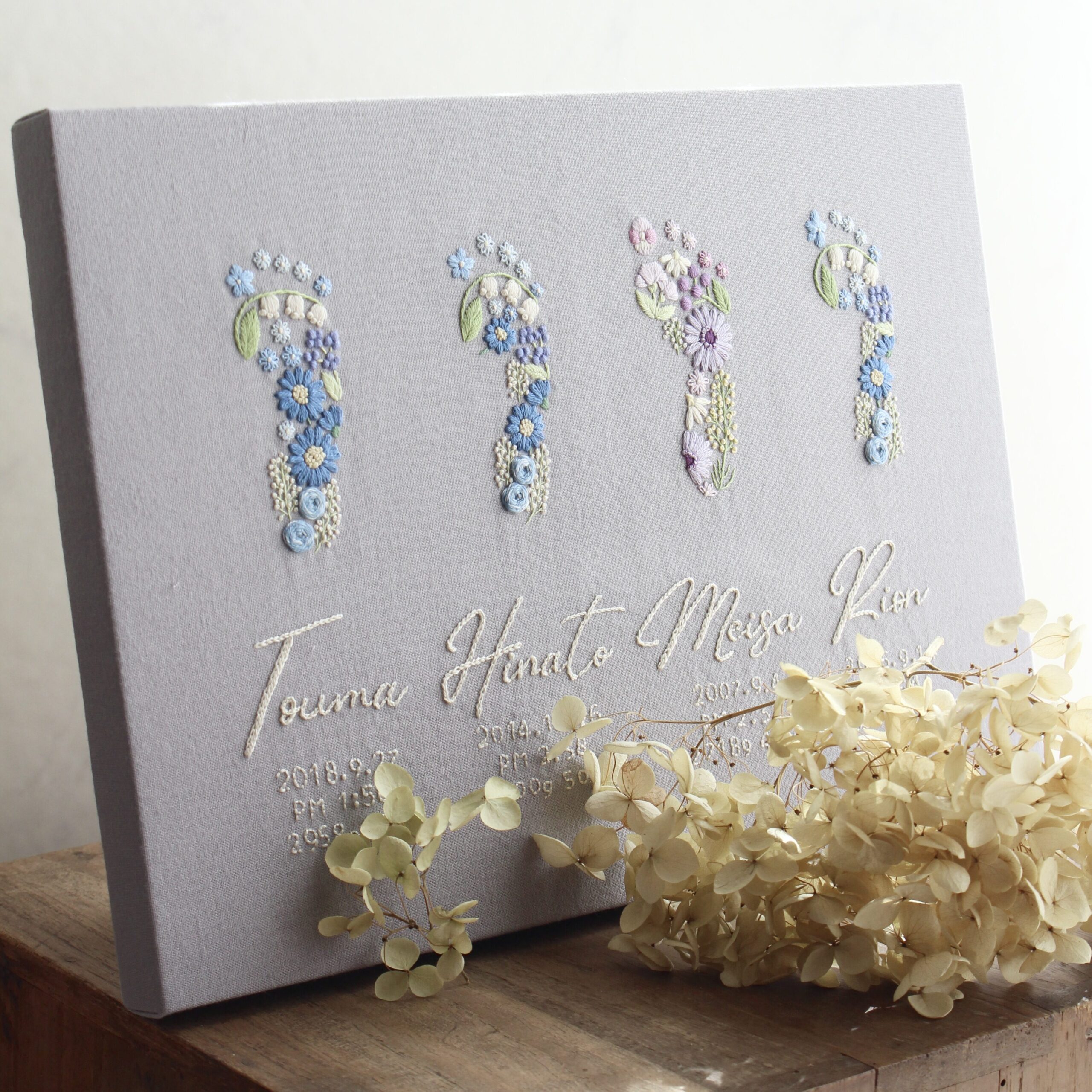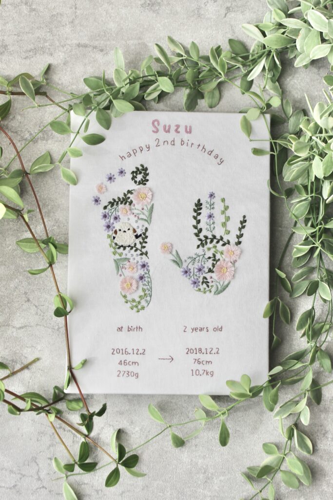 小さな手足型を前にすると、ふわっとその子の存在感や、オーダーくださった方の愛情が伝わってくるように感じます。その気持ちをそっと刺繍に重ね、世界にひとつだけのかたちにしてお届けしています。お子様へ、お孫さんへ、大切なお友達のお子さんへ──贈る方も受け取る方も、日常の中でそっと微笑む瞬間になったら嬉しいです。