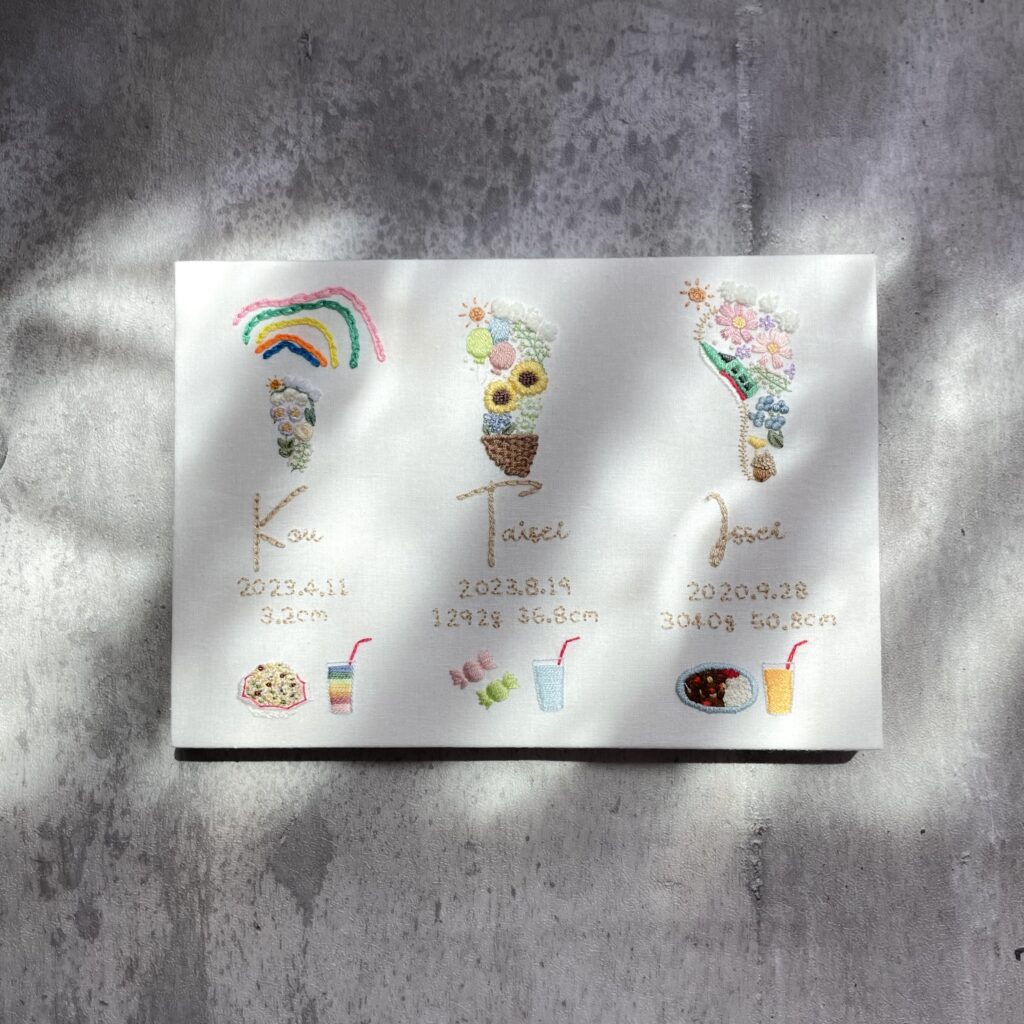 その思いをカタチにできないかと考えていたとき、ご縁あって出逢ったのがeri先生のBaby刺繍。全くの初心者からのスタートでしたが、ひと針ひと針に想いを込めながら制作を続けています。