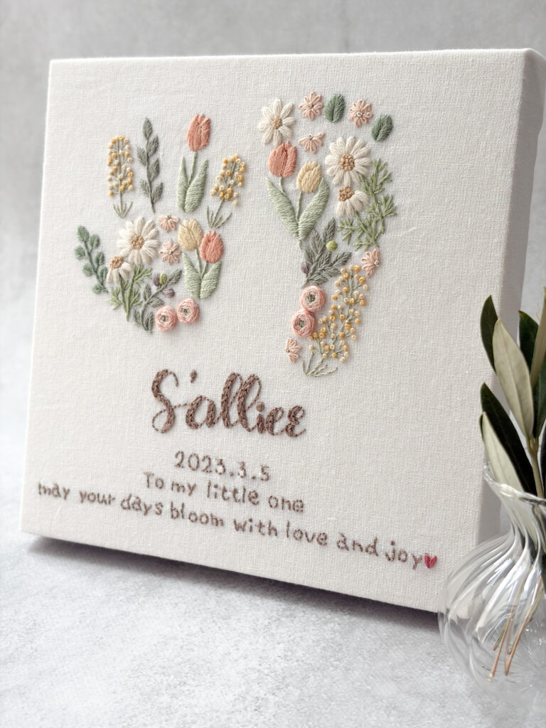 そんな中、自身の結婚式の準備で「何か形に残るものを自分の手で作れたら」と思って、受付サインを作ったことが刺繍を始めるきっかけとなり、ひと針ひと針進める時間の楽しさを知って、もっと学びたいと思うようになりました。
